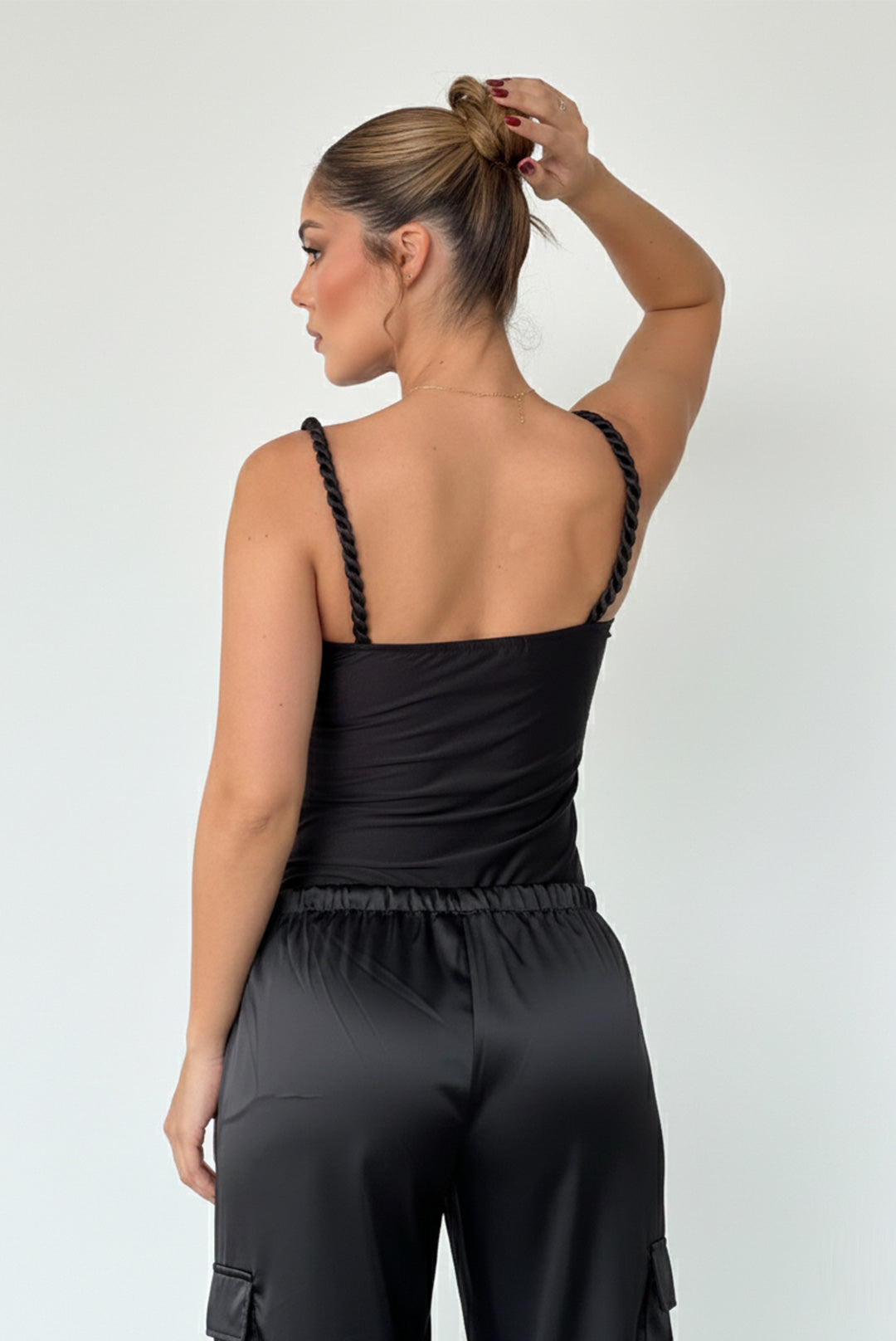 El Body Silvana es la definición de elegancia minimal con un toque sensual. Su escote corazón con fruncido realza el busto de forma natural, mientras que los tirantes trenzados aportan un detalle sofisticado y moderno. Una pieza versátil que se adapta tanto a looks de día como de noche, estilizando la silueta con un fit impecable.