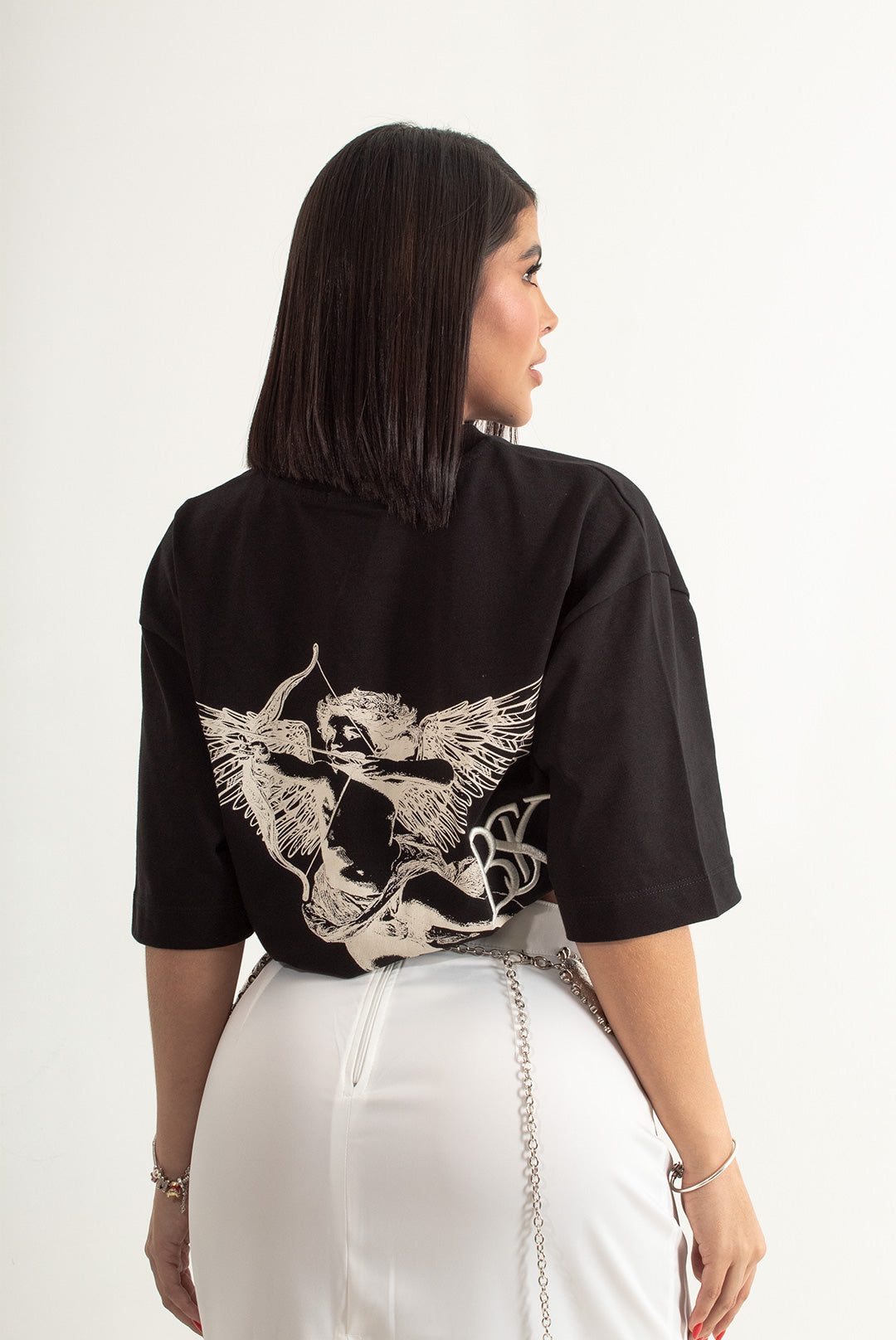 La Camiseta Elisee es una expresión de poder sereno y belleza atemporal. Su diseño oversize y su tonalidad profunda evocan sofisticación, mientras el estampado angelical en la espalda aporta un toque místico y celestial que eleva cualquier look.