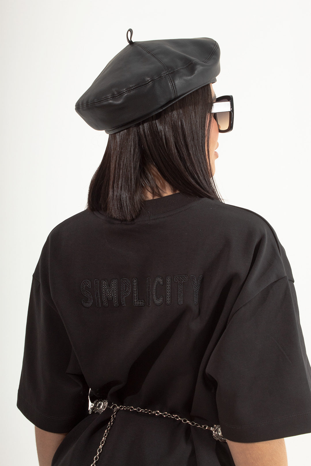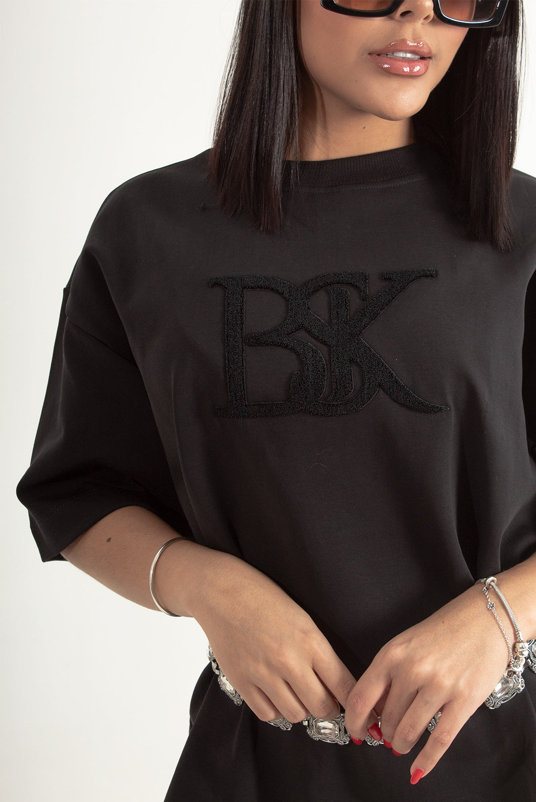 La Camiseta NOVA es minimalismo con actitud: una silueta oversized en negro total que cae con power y se siente ultra cool. El frente lleva el logo BSK en relieve tono a tono, y en la espalda el mensaje “SIMPLICITY” bordado, como un statement silencioso que habla fuerte. Úsala suelta o ceñida con cinturón: siempre se ve elevada.