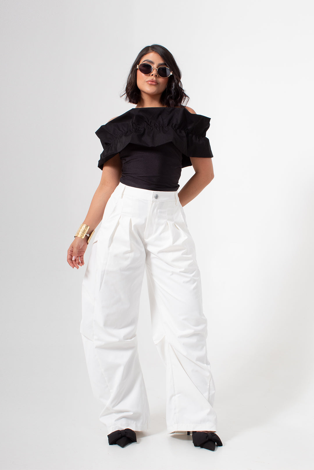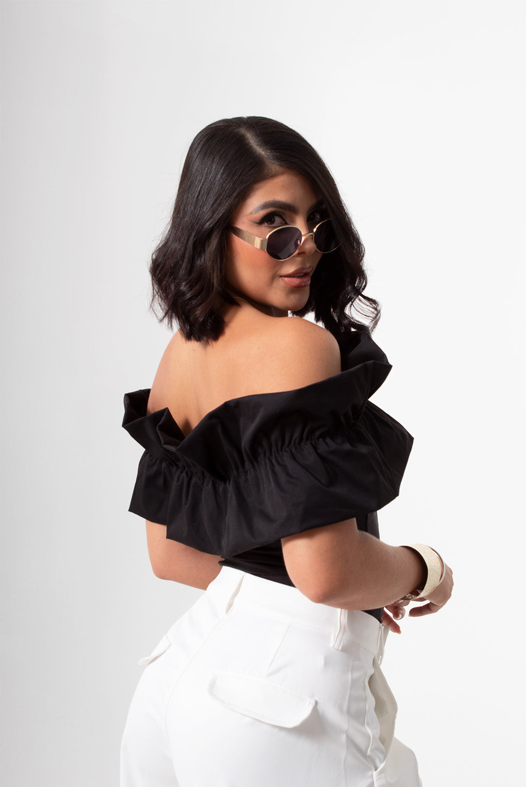 El croptop BRENDA es una prenda moderna y sofisticada que combina frescura con un aire chic. Su diseño off-shoulder realza los hombros y el escote con un toque sutilmente sensual, mientras que el detalle de volantes en la parte superior aporta movimiento y volumen, logrando un look único y femenino.