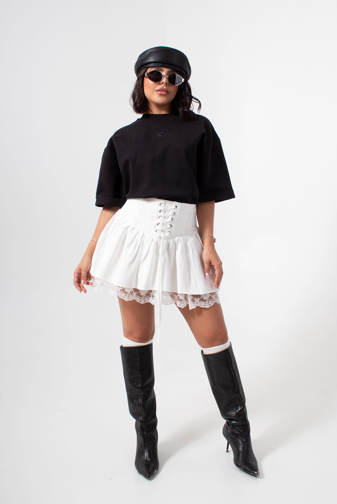 La Falda Vanessa es una pieza encantadora que combina romanticismo y fuerza en una misma silueta. Su diseño con pretina tipo corset realza la cintura, mientras los delicados encajes añaden un toque sutil y femenino.