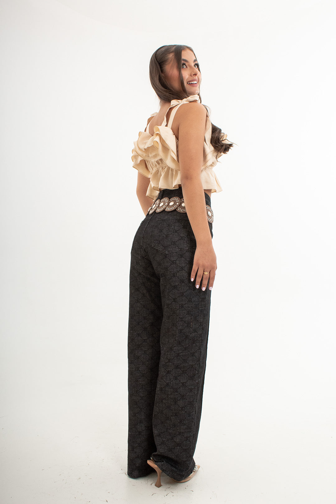 El Jean Kavala es esa pieza que hace que un look negro básico se sienta de noche, de fiesta y con intención. Su tiro medio/alto y pierna amplia estilizan sin esfuerzo, mientras el jacquard en negro (con textura sutil) le da ese “lujo silencioso” que se ve caro sin gritar.