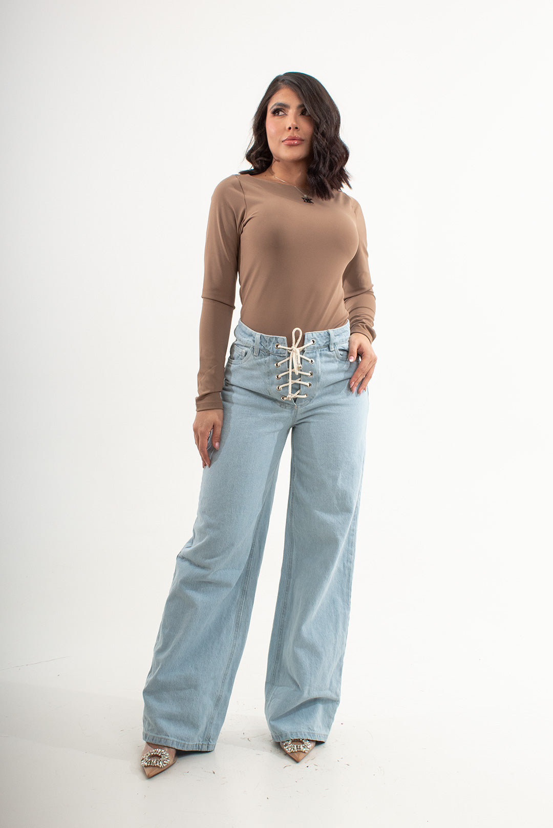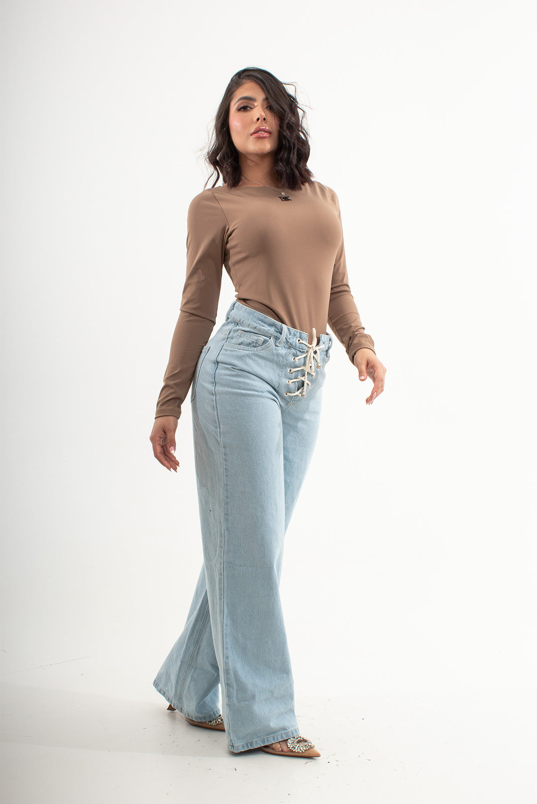 El Pantalón Bilbao es denim con actitud marinera y vibe muy fashion: un jean wide leg que se ve relajado, pero tiene un toque protagonista gracias a su amarre tipo corsé en el frente. Su tiro alto abraza la cintura y la define al instante, mientras la bota amplia cae con movimiento fluido para alargar visualmente las piernas y dar ese efecto “piernas eternas”.
